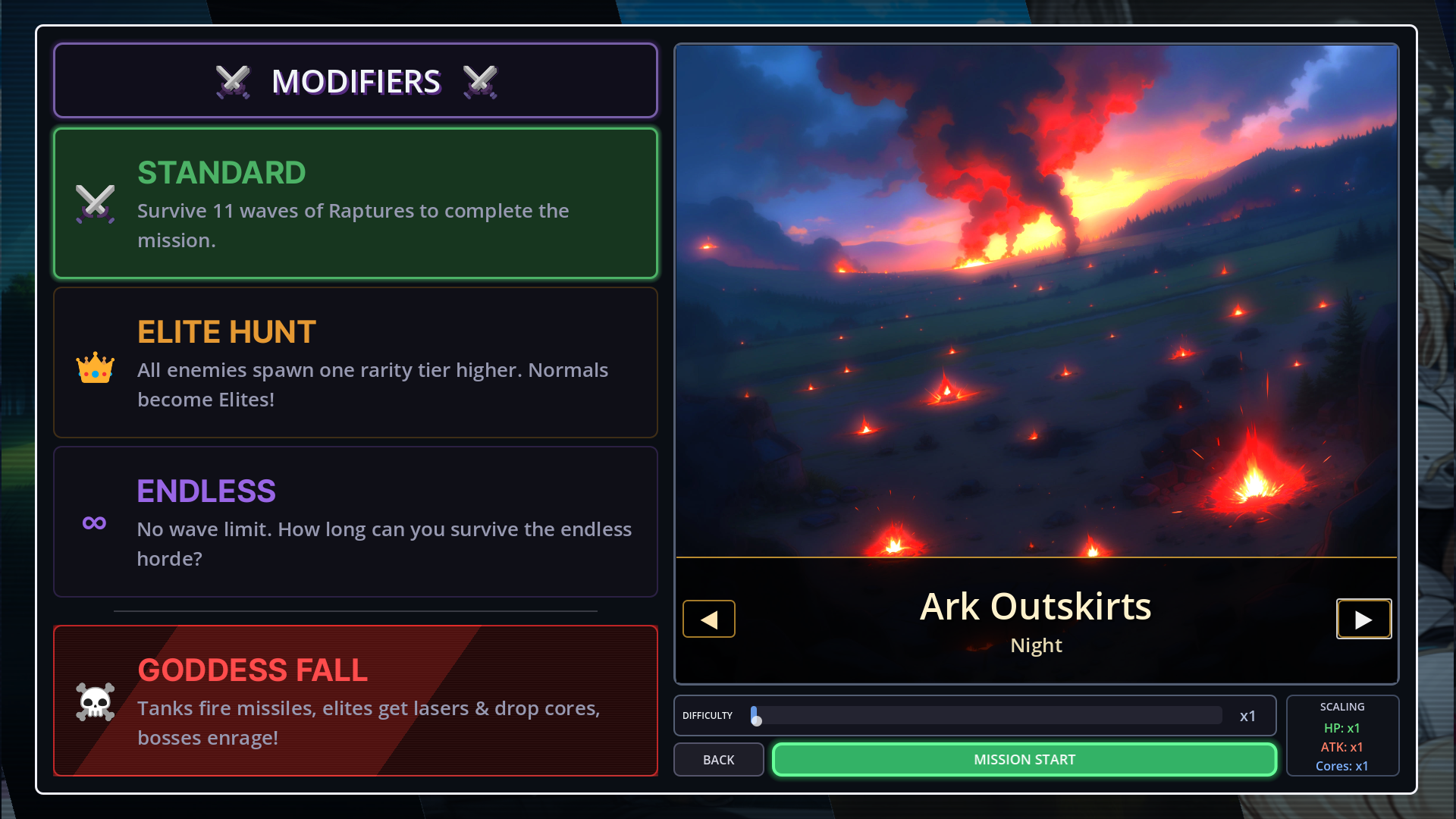 Difficulty: Adjustable slider (higher = tougher enemies, more rewards)