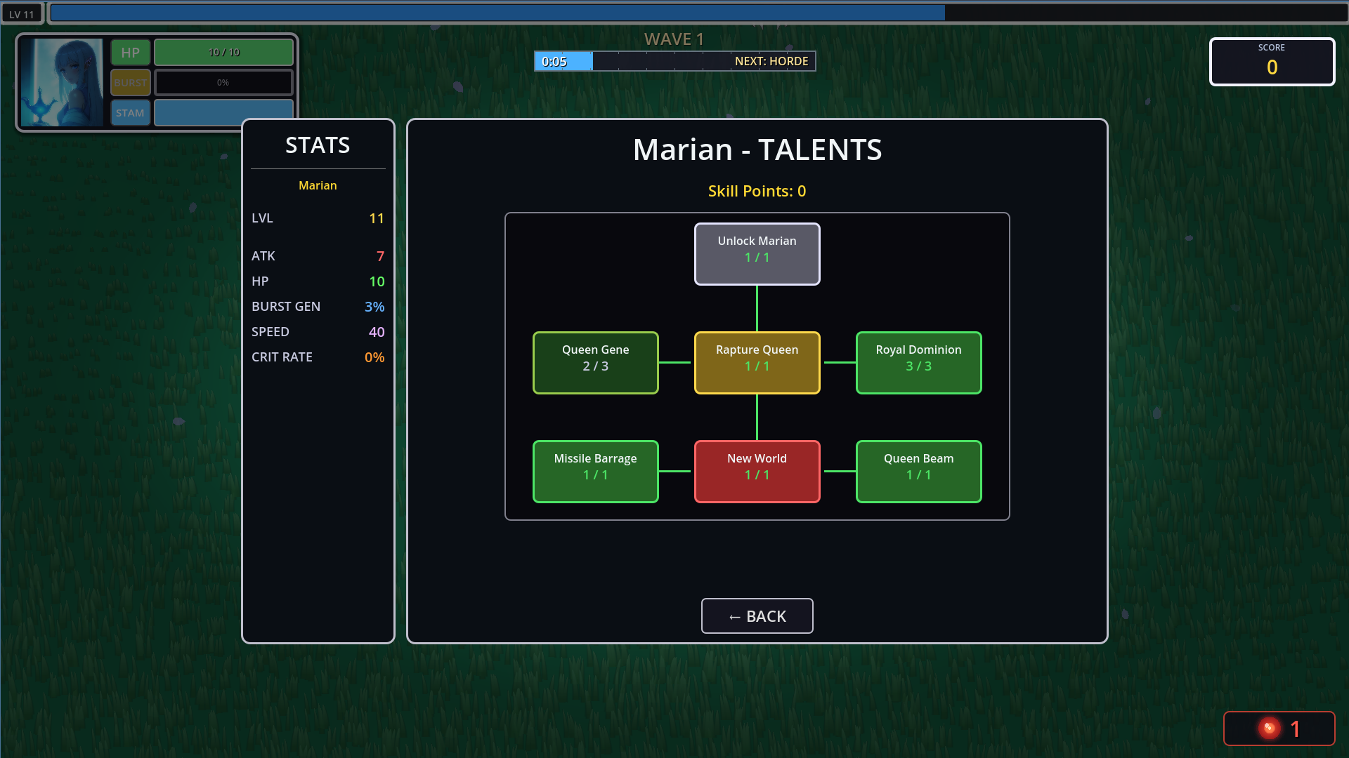 - Character Upgrades: Unique powerful abilities (e.g., extra lives, heal on kill, 2x XP)